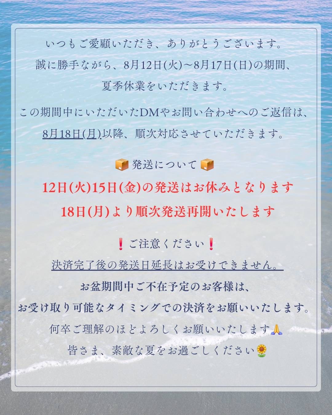 ・8月12日(火)と8月15日(金)の発送はお休みとなります。